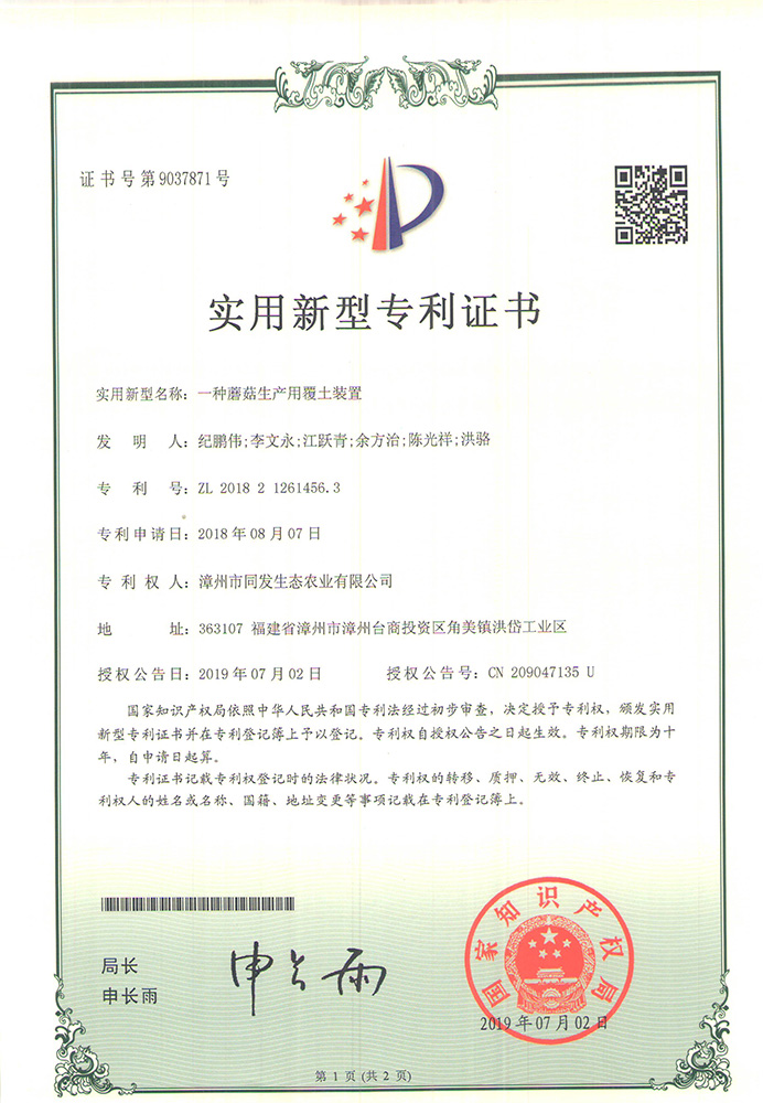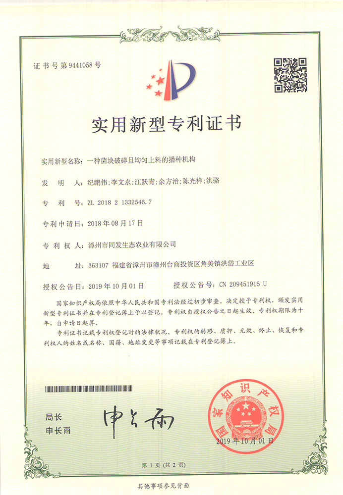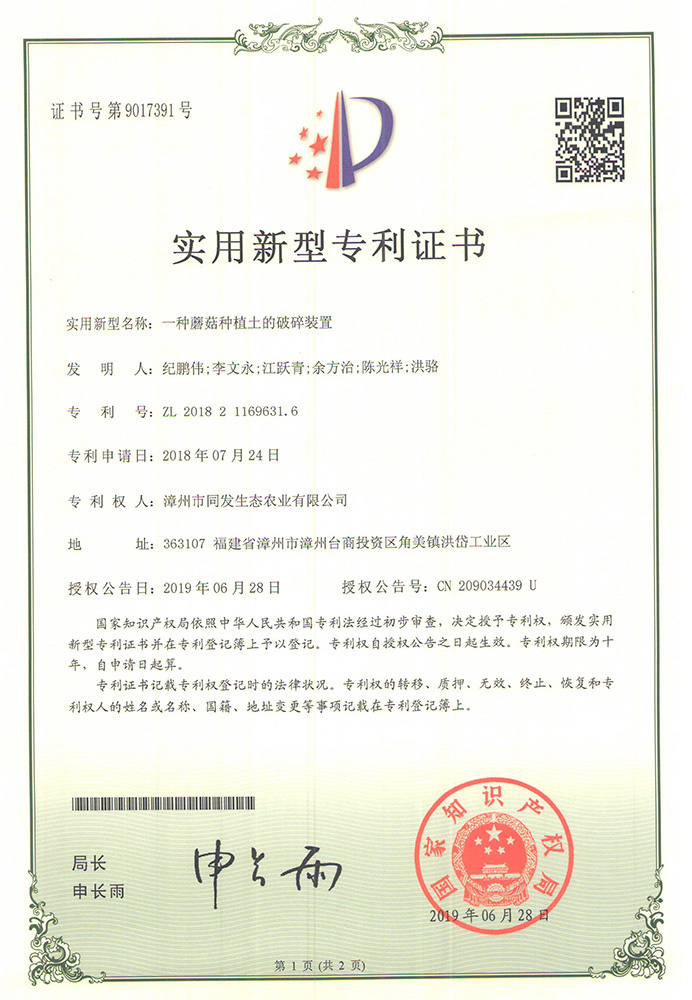 一種蘑菇種植土的破碎裝置專利證書