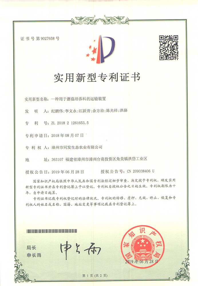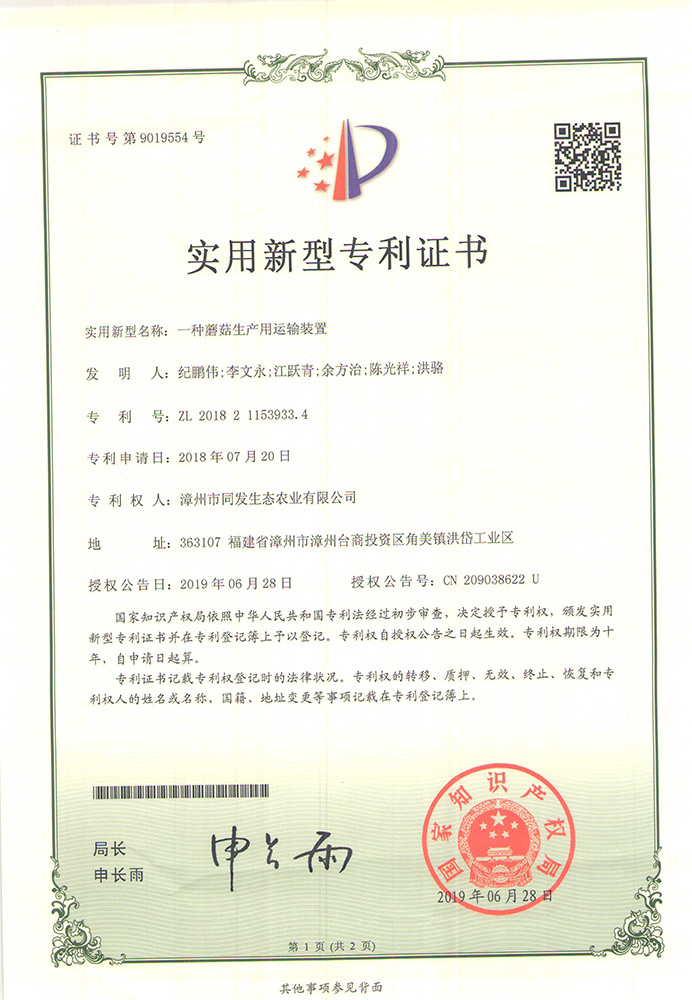 一種蘑菇生產用運輸裝置專利證書