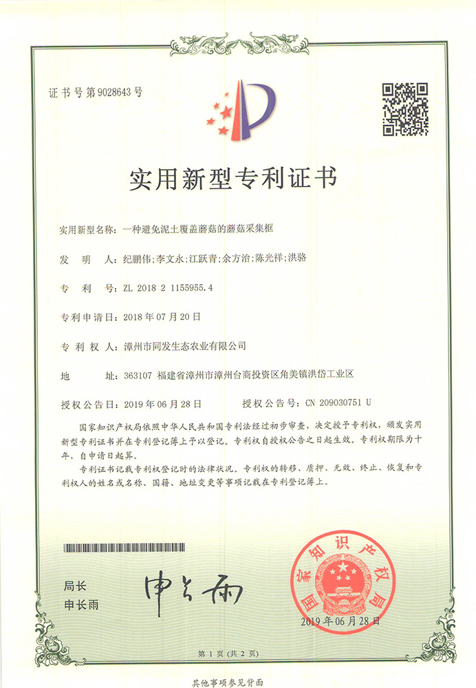 一種避免泥土覆蓋蘑菇的蘑菇采集框專利證書