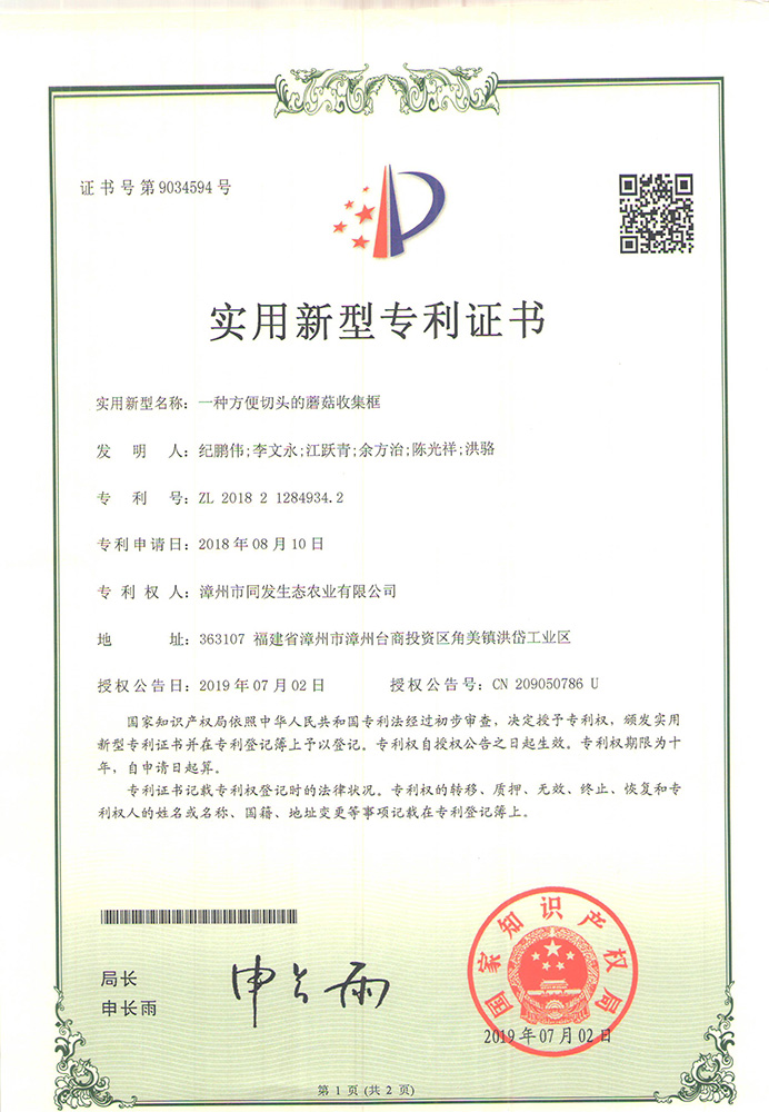 一種方便切頭的蘑菇收集框專利證書