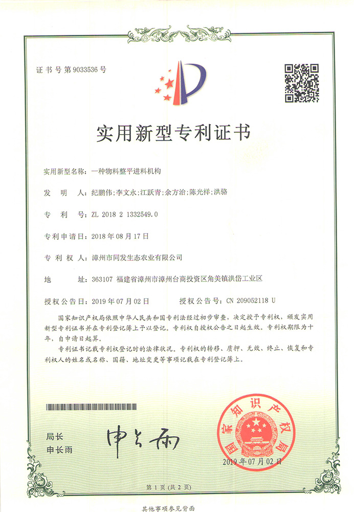 一種物料整平進料機構專利證書