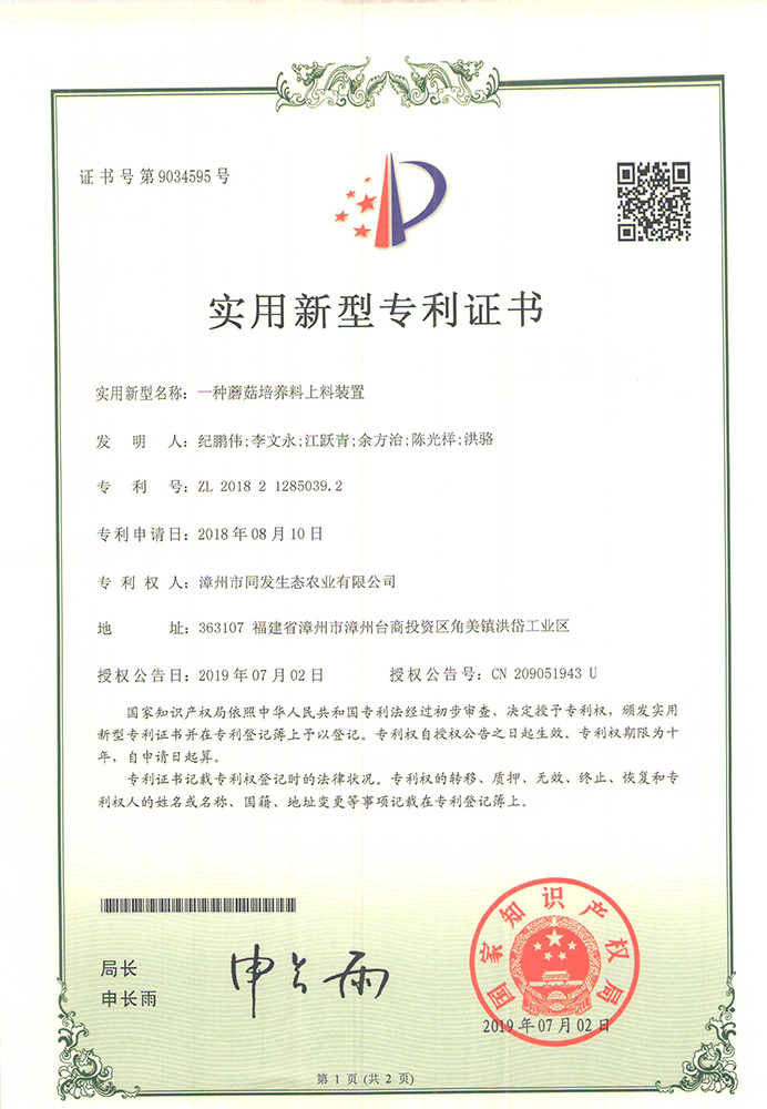 一種蘑菇培養料上料裝置專利證書