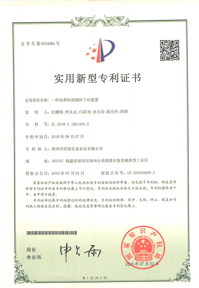 一種培養料的輔料下料裝置專利證書