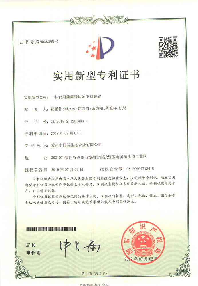 一種食用菌菌種均勻下料裝置專利證書