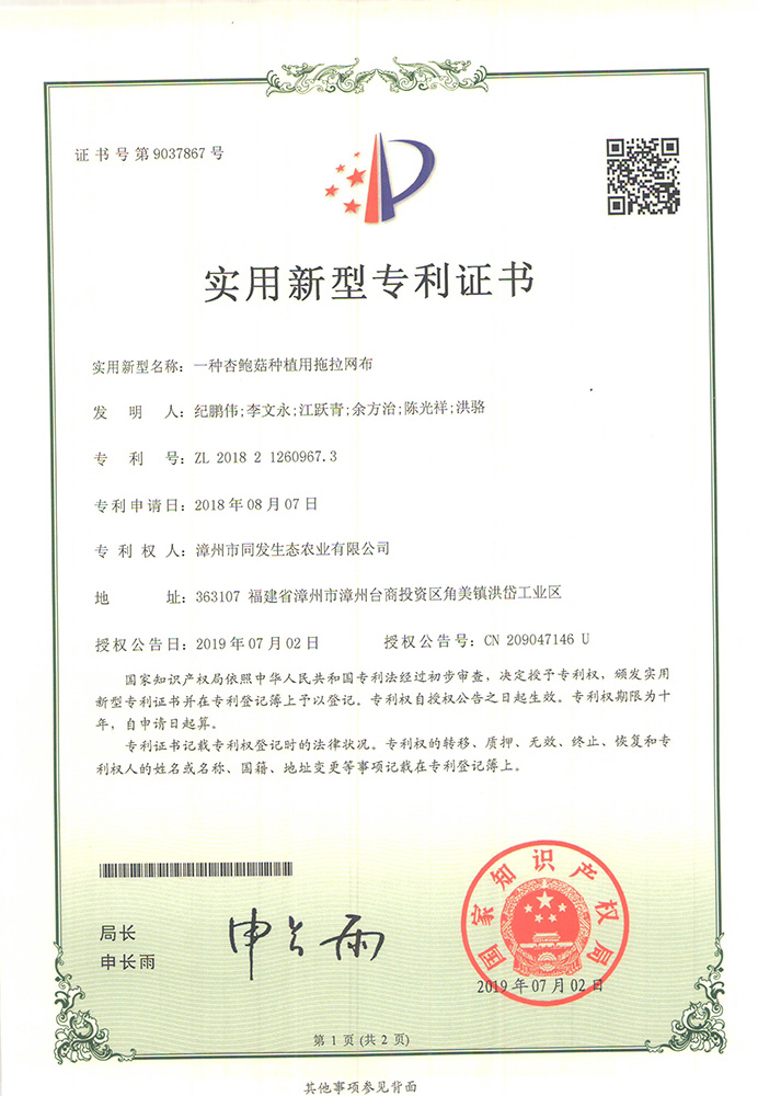 一種杏鮑菇種植用拖拉網布專利證書