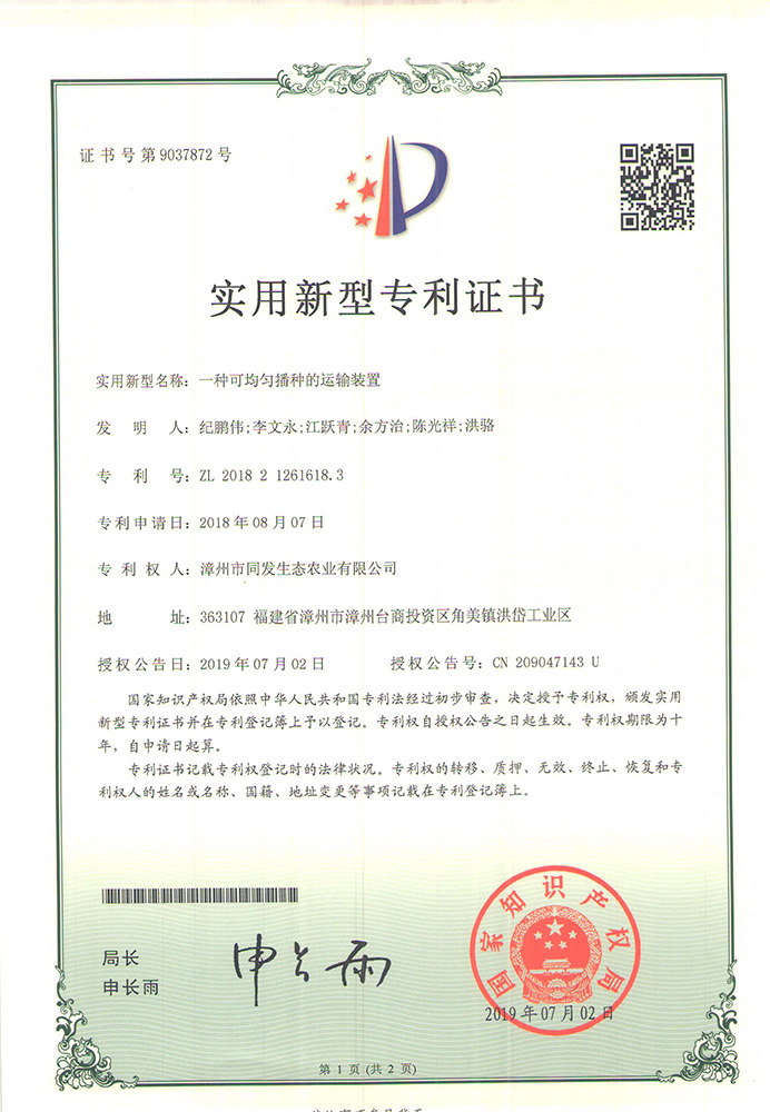 一種可均勻播種的運輸裝置專利證書