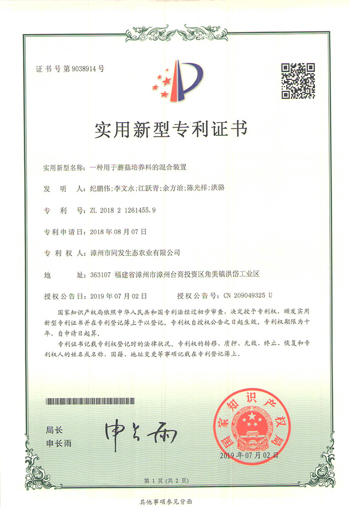 一種用于蘑菇培養料的混合裝置專利證書