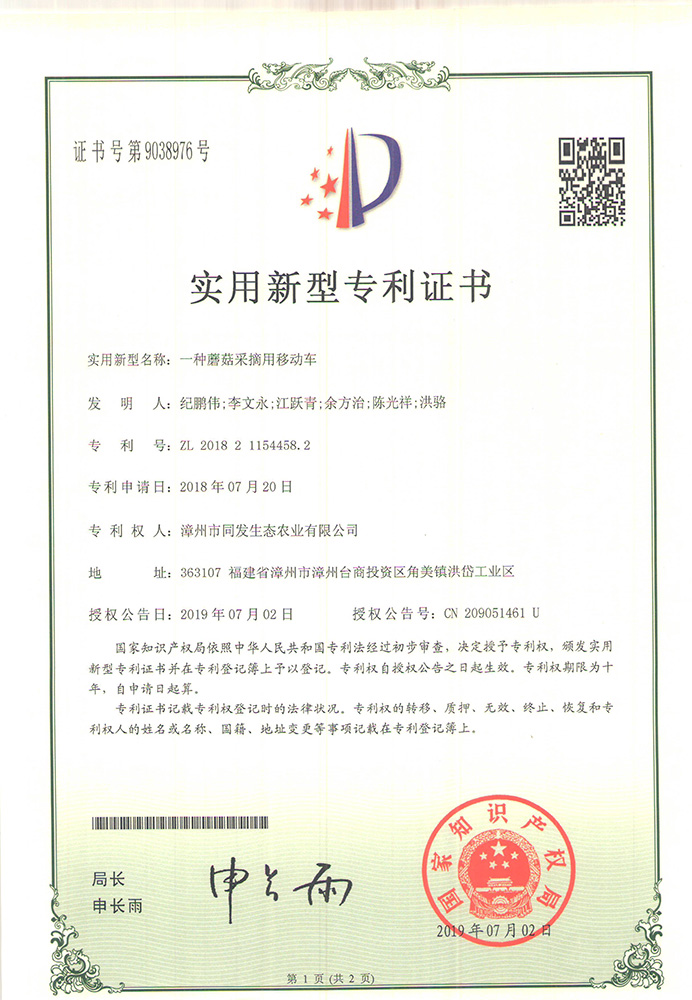 一種蘑菇采摘用移動車專利證書
