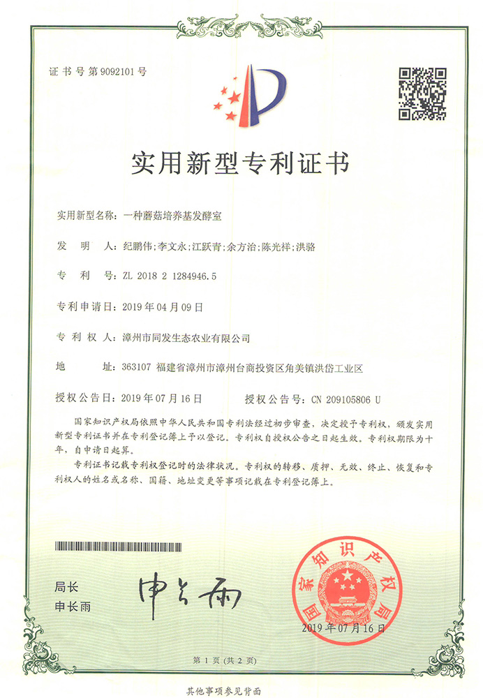 一種蘑菇培養基發酵室專利證書