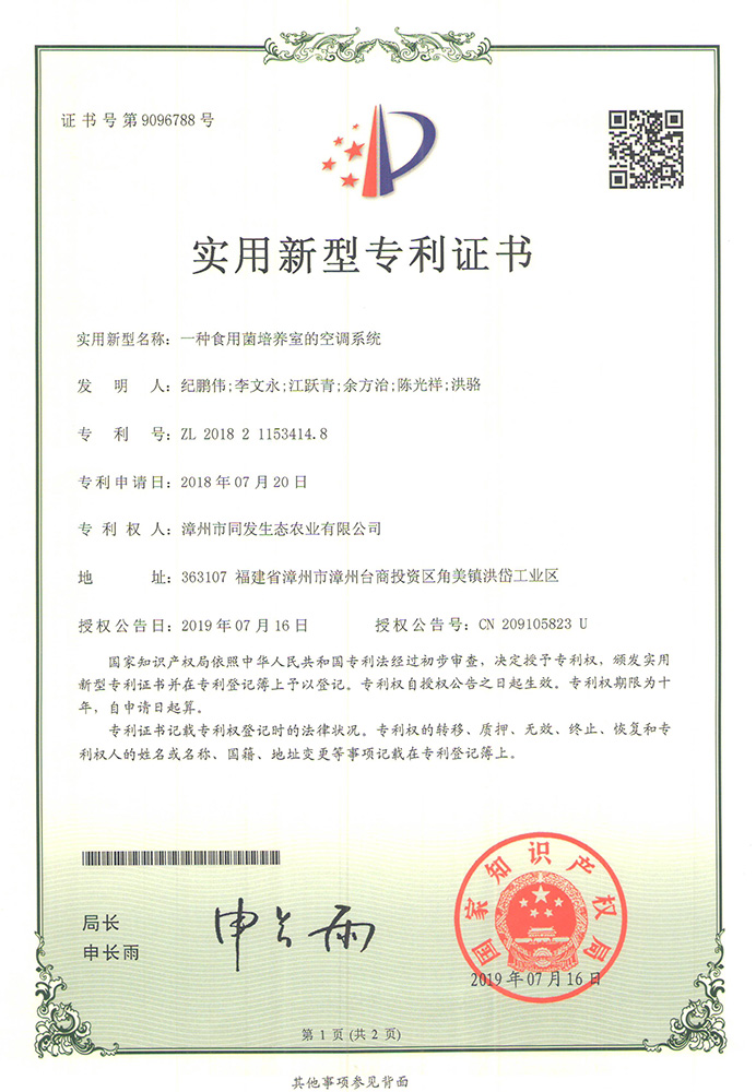 一種食用菌培養室的空調系統專利證書