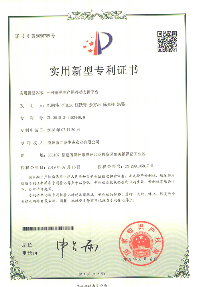 一種蘑菇生產用移動支撐平臺專利證書