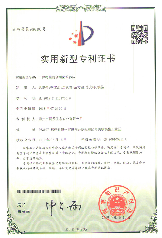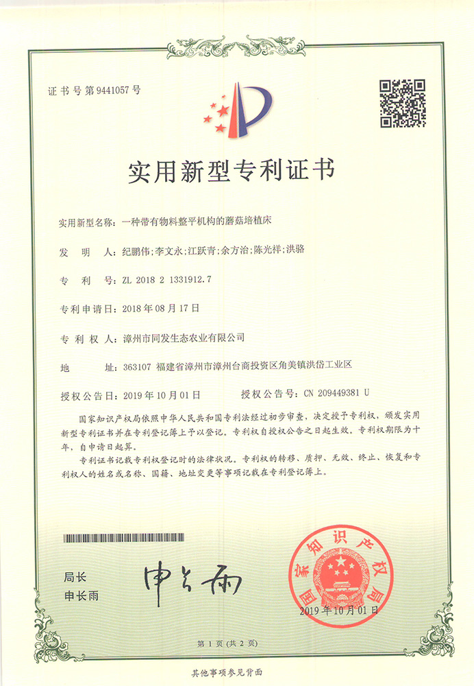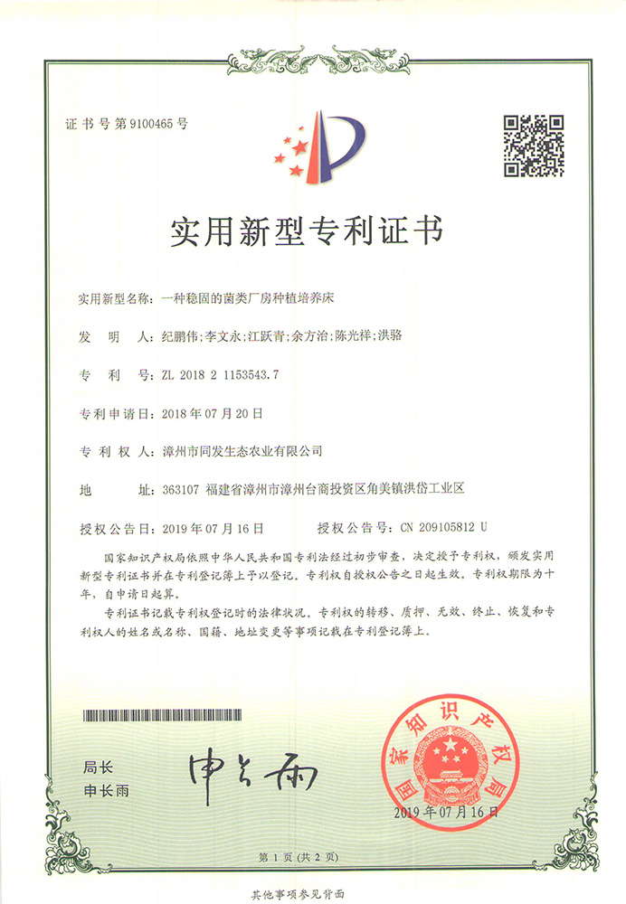 一種穩固的食用菌培養床專利證書