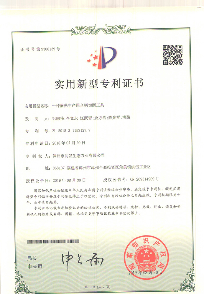 一種蘑菇生產用傘柄切斷工具專利證書