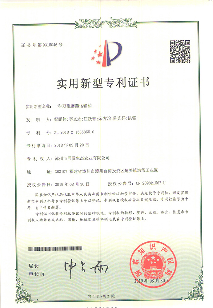 一種雙孢蘑菇運輸箱專利證書
