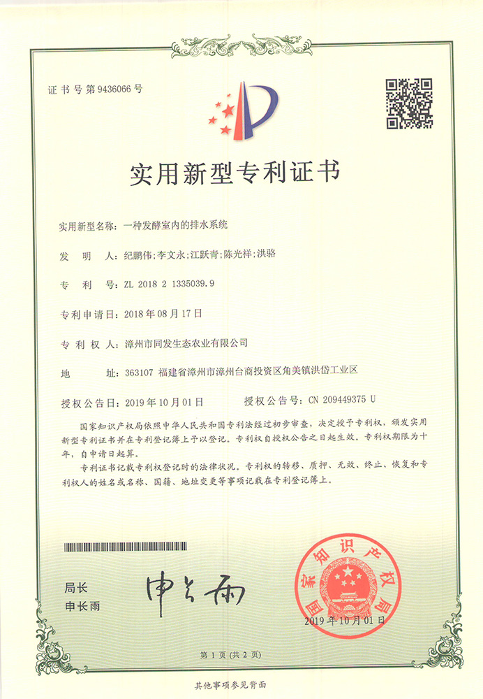 一種發酵室內的排水系統專利證書