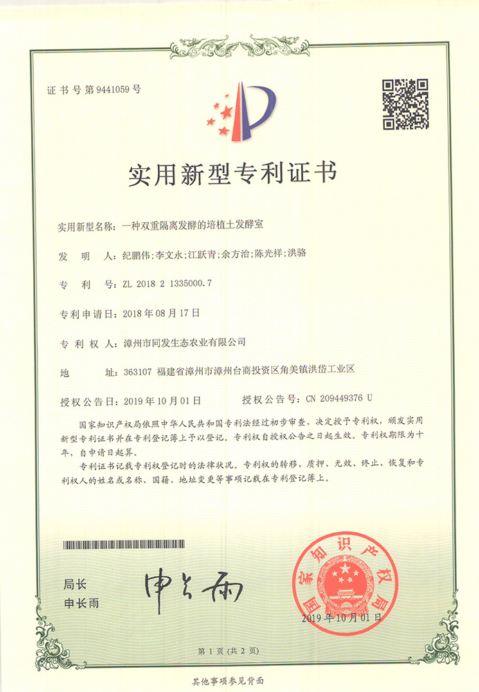 一種雙重隔離發酵的培植土發酵室專利證書