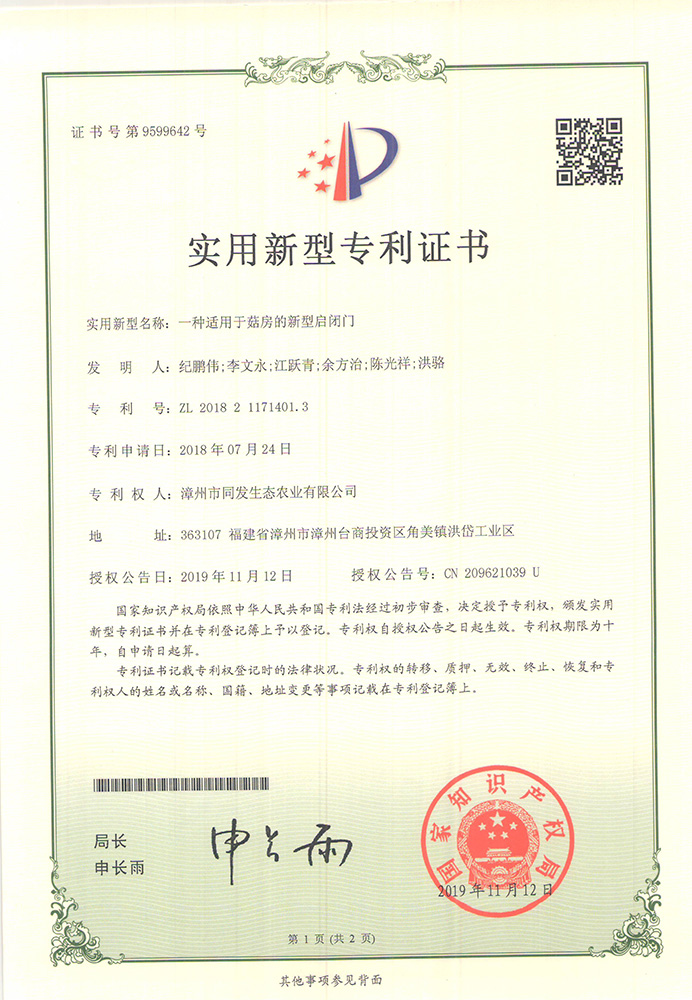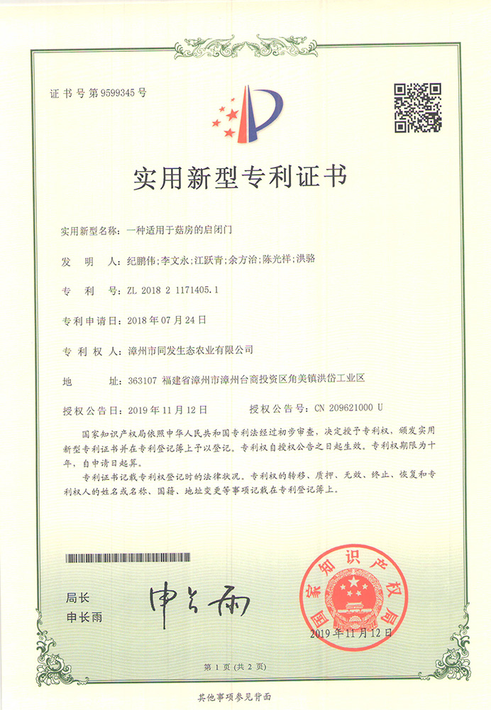 一種適用于菇房的新型啟閉門專利證書