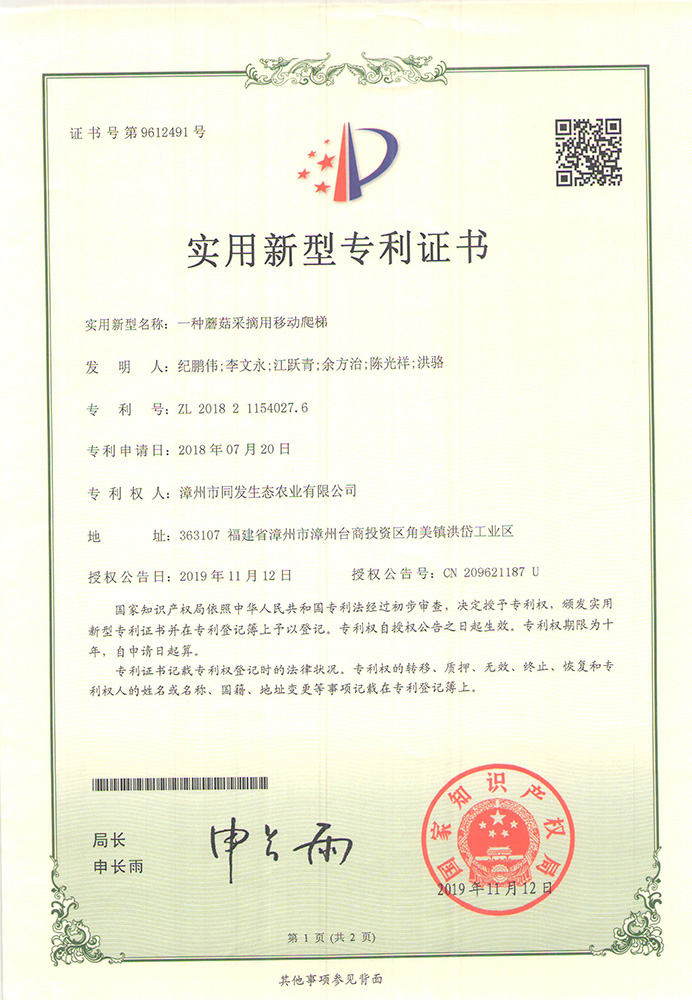 一種蘑菇采摘移動爬梯專利證書